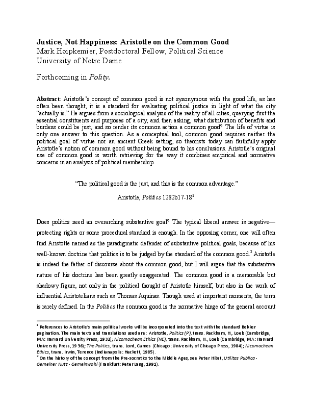Pdf Justice Not Happiness Aristotle On The Common Good Mark Hoipkemier Academia Edu