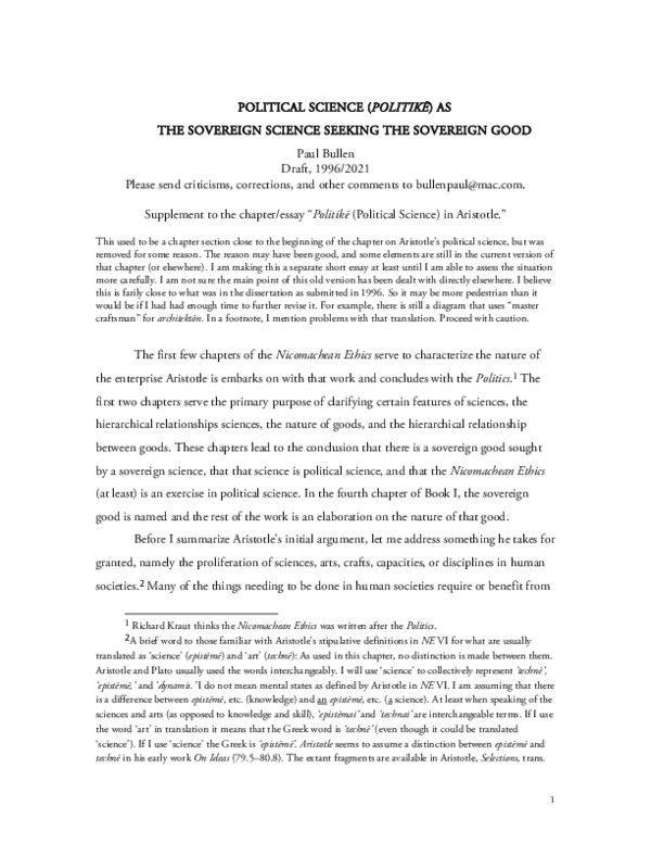 Pdf Aristotle S Political Science As Sovereign Science Seeking The Sovereign Good Paul Bullen Academia Edu